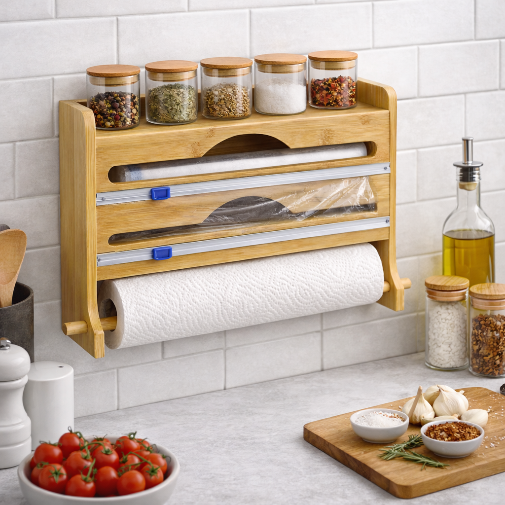 Se você busca organização, praticidade e um visual bonito para sua cozinha , este suporte organizador de cozinha em bambu é a escolha ideal. Ele foi desenvolvido para reunir, em um único lugar, os itens mais usados no dia a dia: filme plástico (PVC), papel alumínio, papel toalha e temperos , deixando tudo sempre acessível e bem organizado.